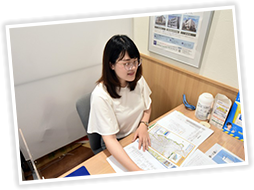 営業スタッフが契約をとってきてくれた案件の契約書類のチェック・入金確認・重要事項の説明などが主な業務となります。日々忙しくしておりますが、申込後の契約業務で重要な部分となりますので、緊張感・やりがいをもって日々取り組めております。また、ご契約時にお客様と直接接する機会もありますので、事務作業ばかりに偏らずに業務ができております。